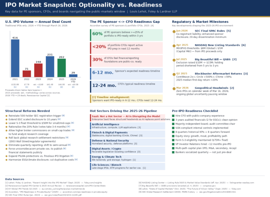 - Accordion’s 2026 survey reveals the scale of the problem: 60% of PE sponsors see IPO potential in their portfolio within three years, yet fewer than 20% of portfolio CFOs are actively preparing. Only 30% feel their finance and reporting foundations are fully public-company ready.